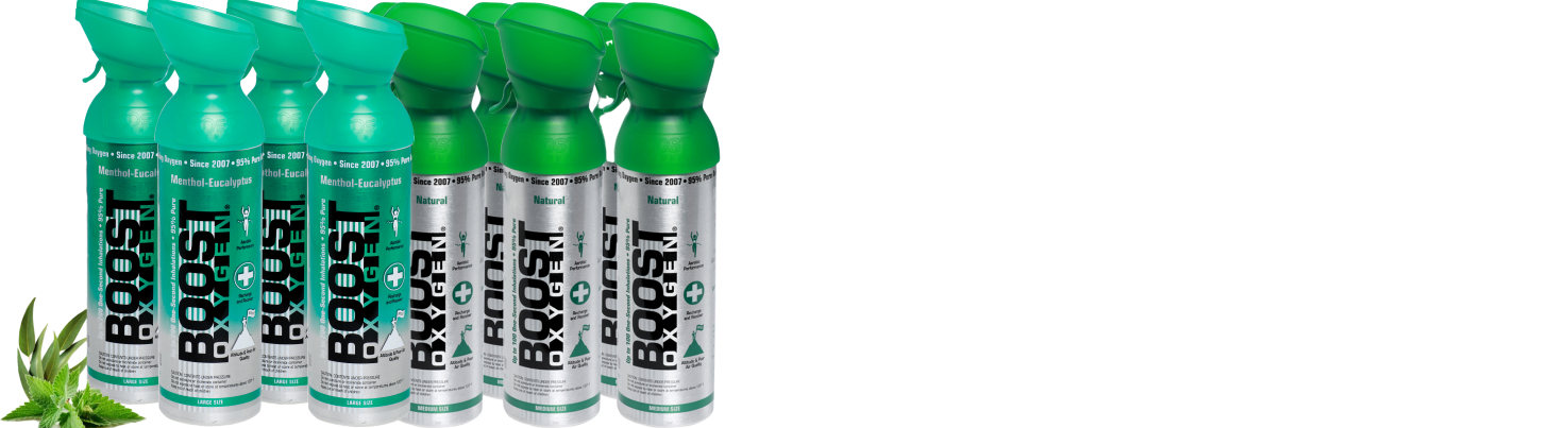 Boost Oxygen er 95% ren supplerende ilt. Fås i aromaterapeutisk pebermynte i 2 størrelser: